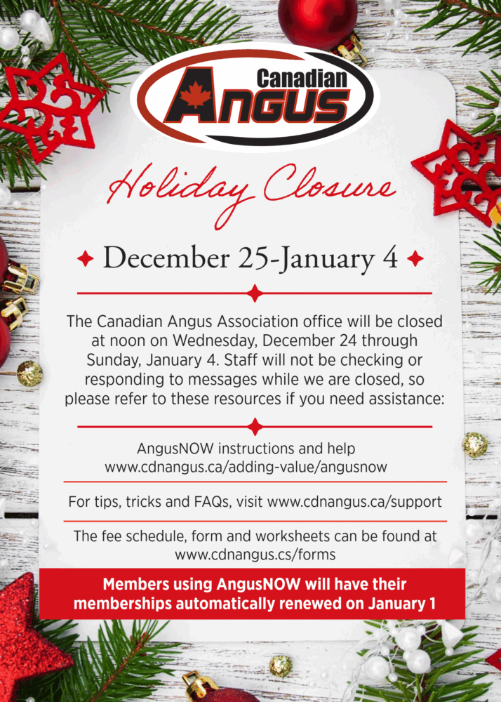 AngusNOW is the live Canadian Angus Association registration system. AngusNOW provides you with the tools to register animals, enter calving data, enter weights, transfer animals and much more from the comfort of your home!